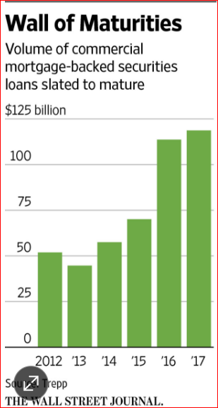 In the meantime a wall of loosely-underwritten, boom-time debt with ten-year maturities are coming due this year. And despite the run-up in values, many borrowers can’t retire these loans. Grant reported last November, “In all, Morningstar Credit Ratings LLC predicts borrowers won’t be able to pay off roughly 40% of the commercial mortgage-backed securities loans coming due [in 2017]. Suburban office properties and shopping centers are being hit particularly hard, said Edward Dittmer, a Morningstar vice president.”