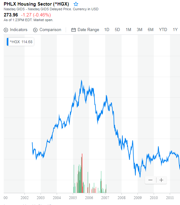 Mark Thornton makes the point in his new book “The Skyscraper Curse” that the housing market peak was signaled by a high in home-builder stocks in the summer of 2005.